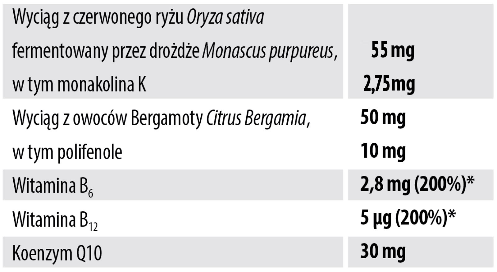 W skład produktu wchodzi wyciąg z czerwonego fermentowanego ryżu standaryzowany na monakolinę K.